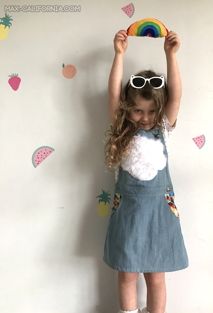 I shortened the skirt pattern piece by 5cm, but in the future I'd probably do it even shorter (eddie is a short girl, lol) and instead of having the bib in two separate pieces I cut the fabric on the fold (eliminating 2cm from the pattern piece). I also changed the big pocket to a big fluffy cloud!